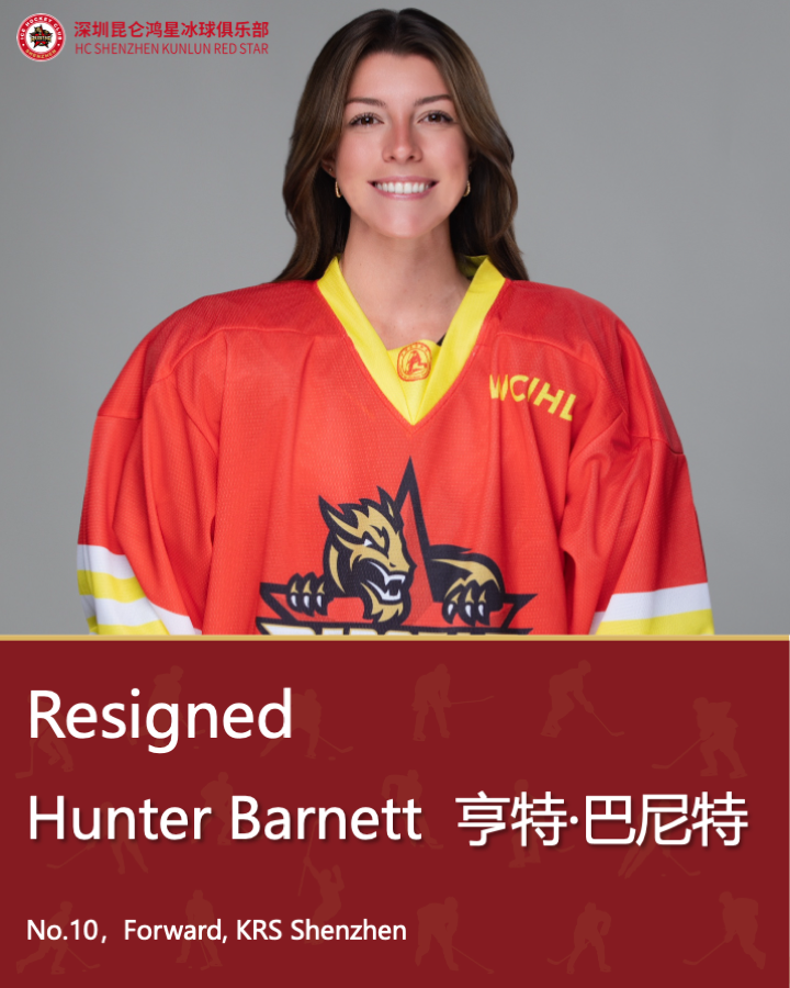 亨特·巴尼特(Hunter Barnett)出生于2000年8月6日,加拿大人,左边锋,身高1.68米,左手射门,2018-2023年大学就读于罗彻斯特理工学院和普洛威顿斯学院,5年参加NCAA共154场比赛51(27+24)分。2023-2024赛季效力于德国联赛曼海姆疯狗队,在26场比赛得到22(10+12)分。2024-2025赛季加盟深圳昆仑鸿星女子冰球队,在27场比赛得到32(12+20)分。