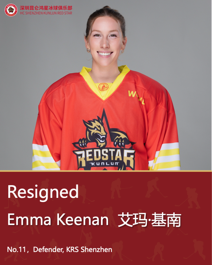 艾玛·基南(Emma Keenan)出生于1997年11月26日,美国/加拿大人,后卫,身高1.71米,左手射门,2015-2019年大学就读于克拉克森大学,参加NCAA共156场比赛39(4+35)分,2016-2018赛季连续两个赛季夺得NCAA总冠军。毕业后在瑞典女子冰球联赛打球2个赛季,随后在PHF的布法罗美人和康涅狄格白鲸各效力一个赛季,2023-2024赛季PWHL处子赛季加盟多伦多队。2024-2025赛季加盟深圳昆仑鸿星女子冰球队,在27场比赛得到28(13+15)分,荣膺联赛最佳后卫称号。